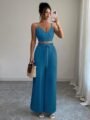L’ensemble deux pièces séduit d’abord par sa teinte bleu paon, à la fois chic et originale. Cette couleur profonde et lumineuse apporte une touche de sophistication à votre garde-robe. Associé à un pantalon à jambe large, ce gilet à bretelles offre un équilibre parfait entre allure décontractée et élégance travaillée.