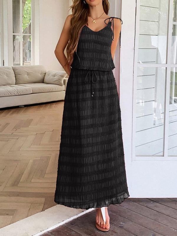 Après avoir enfilé son ensemble noir taille S, elle se regarde dans le miroir et se sent instantanément transportée dans une ambiance balnéaire. Le haut léger et fluide met en valeur sa silhouette, tandis que la jupe assortie lui donne une allure élégante et décontractée. Elle se sent prête à affronter la journée avec style et confort.